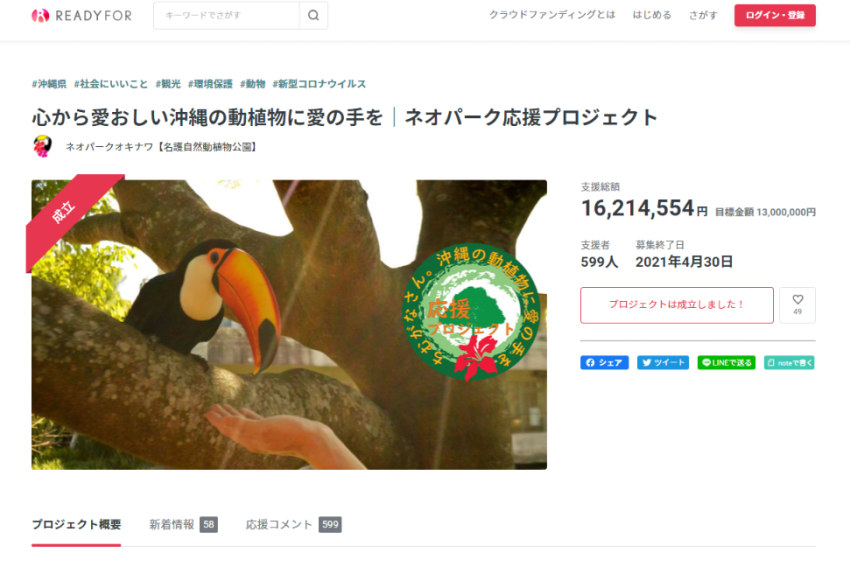 2021年4月30日(金曜日)23時をもちましてクラウドファンディング「心から愛おしい沖縄の動植物に愛の手を|ネオパーク応援プロジェクト」が終了し、2か月間で総額16,214,554円、代理支援の方も含めて750名以上の方にご支援頂きました。
